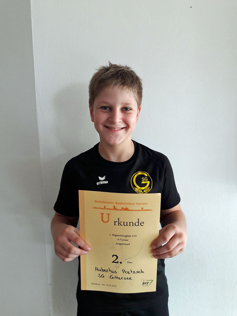 Am Sonntag fand die 1. Regionalrangliste der neuen Saison 2019 in den Altersklassen u13 und u19 in Radebeul statt. Bei den Jungs u13 spielte sich Hubertus Pretzsch mit Setzplatz zwei auch ungefährdet bis ins Finale vor. Hier wartete nicht wie erwartet Leonard Spaethe (TSV Dresden), sondern Valentin Schubert (SSV 91 Brand-Erbisdorf). Leider musste sich Hubertus mit 18:21 und 20:21 geschlagen geben. Ein guter 2. Platz für Hubertus. Auch Finn Schuppan und Joey Feller konnten ihr Auftaktmatch siegreich gestalten, mussten sich dann aber im Viertelfinale beide geschlagen geben. Auf der Verliererseite konnte Finn dann wieder sein erstes Spiel gewinnen. Joey unterlag  denkbar knapp mit 14:15 im 3. Satz gegen Erik Trinowitz (SG Weixdorf). Joey konnte in den Platzierungsspielen noch ein Spiel für sich entscheiden und wurde 11. Finn unterlag bei 7/8 ebenfalls ganz knapp mit 14:15 im 3. Satz gegen Luca Rudolph (TSV Dresden). Im Spiel um Platz 7 und 8 musste sich Finn dann noch einmal knapp in drei Sätzen mit 13:15 geschlagen geben. Ein guter 8. Platz für Finn.