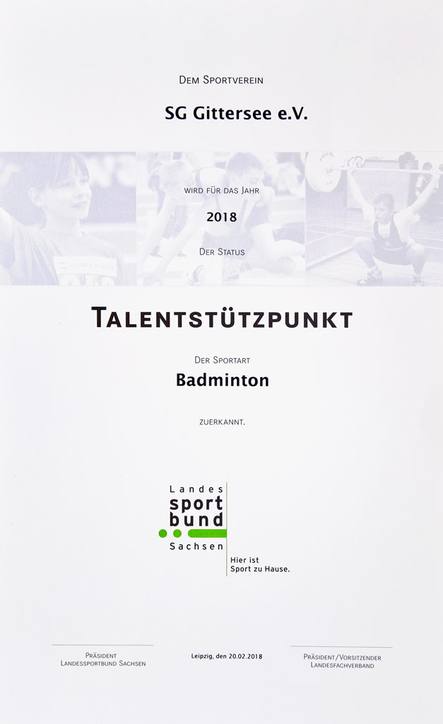 Die SG Gittersee / Abt. Badminton ist einer von zwei sächsischen Badmintonvereinen die 2018 den Status "Talentstützpunkt" tragen dürfen.