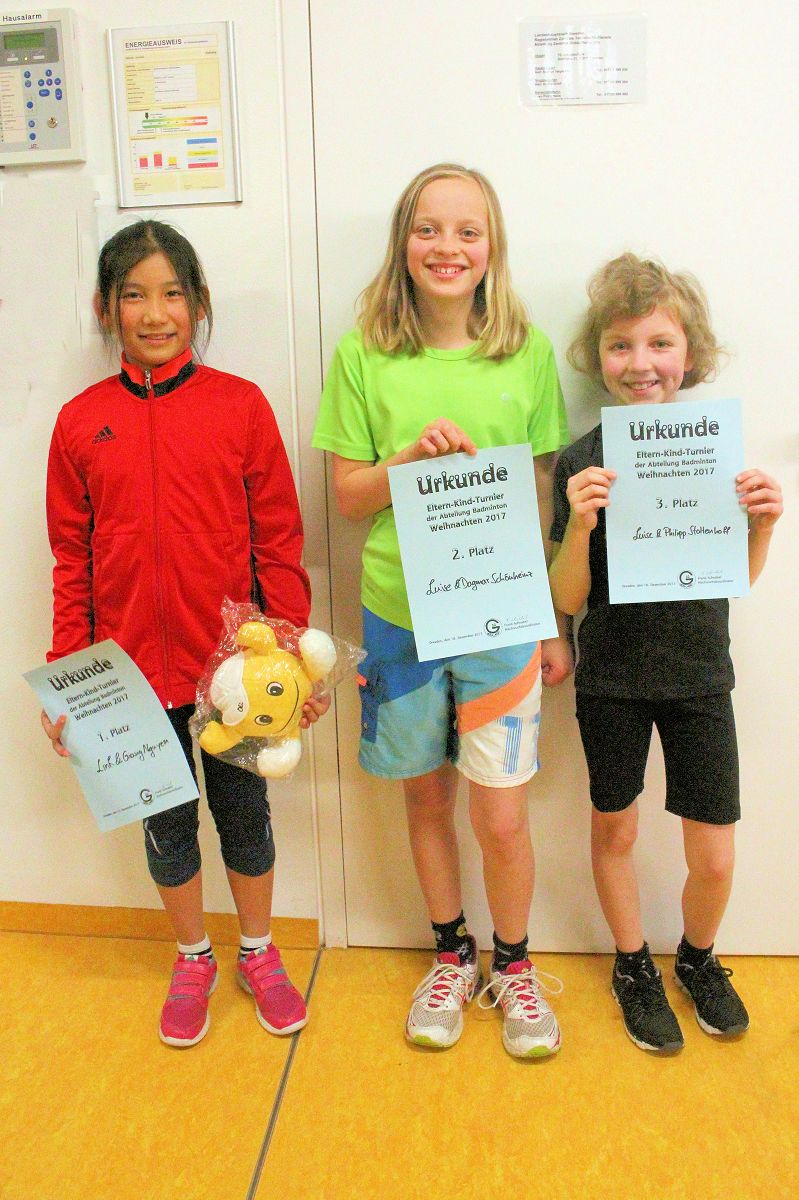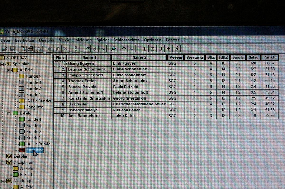 Vom Nachwuchskoordinator Breitensport Frank Schnabel gut vorbereitet, sorgte insbesondere das umfangreiche Buffet für die vorweihnachtliche Einstimmung. -Gemeinsam mit seinen Mit-Übungsleitern Johannes Scheinpflug und Karl Schnabel gewährleistete er einen zügigen Turnierablauf bei den in zwei Wertungsgruppen im Schweizer System gespielten Doppeln. Nach zwei Stunden konnten Giang und Linh Nguyen sowie Hanna Reiche mit Markus Jähring jeweils ungeschlagen auf Platz 1 geehrt werden.