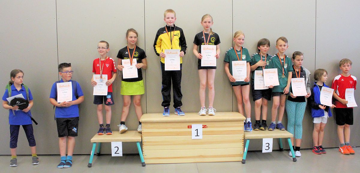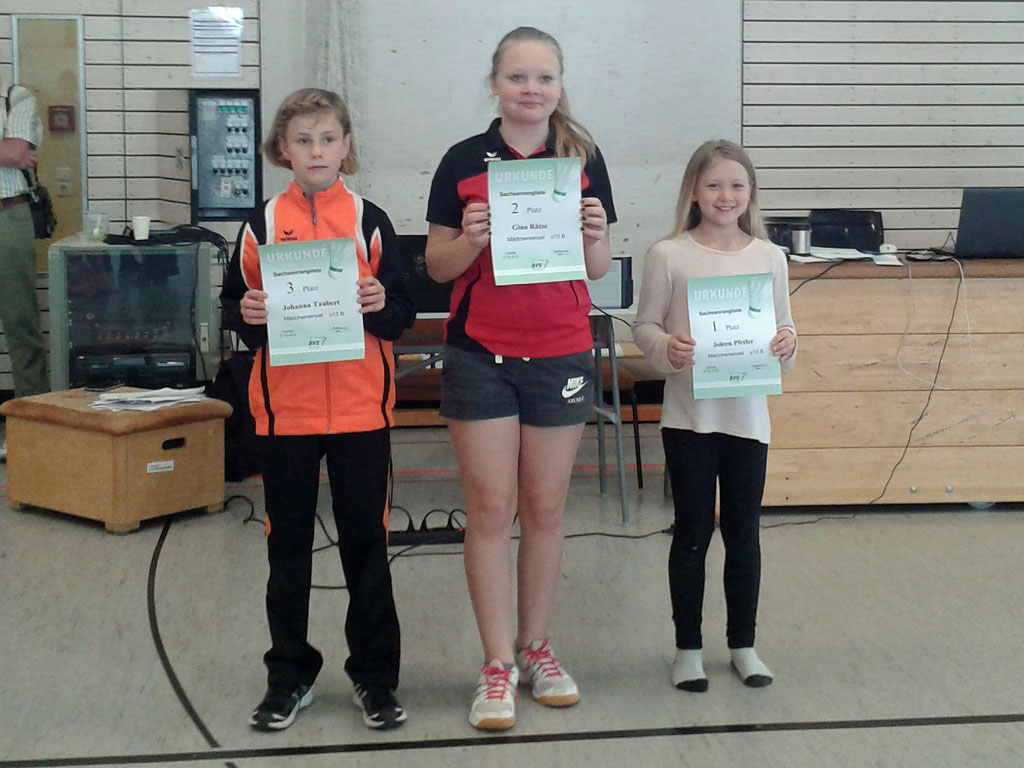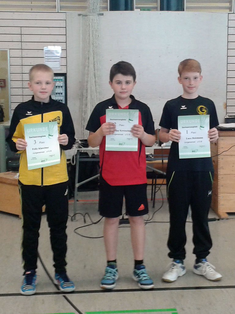 In der u11 gingen erwartungsgemäß alle Titel an die SGG. Positiv ist, dass neben den Titeln auch noch ein zweiter und dritter Platz im Jungeneinzel durch Nils Hahn und Robert Labrenz und jeweils ein dritter Platz im Jungendoppel und Mädchendoppel durch unsere erstjährigen u11er Paula Dietze und Hubertus Pretzsch geholt werden konnten.