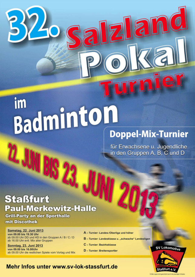 Das zum 32. Male ausgetragene Doppelturnier um die Salzlandpokale hatte mit 53 Mixed, 47 Herren- und 34 Damendoppeln wieder eine gute Resonanz gefunden. Gespielt wurde jeweils in vier Leistungsklassen.