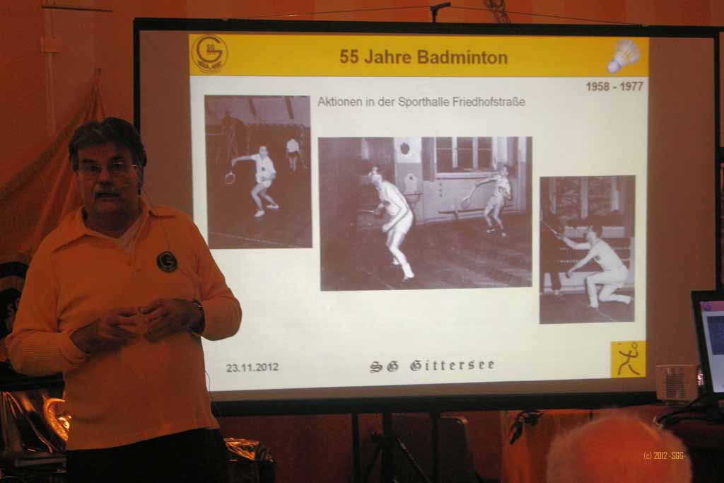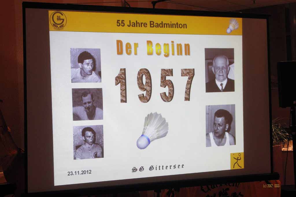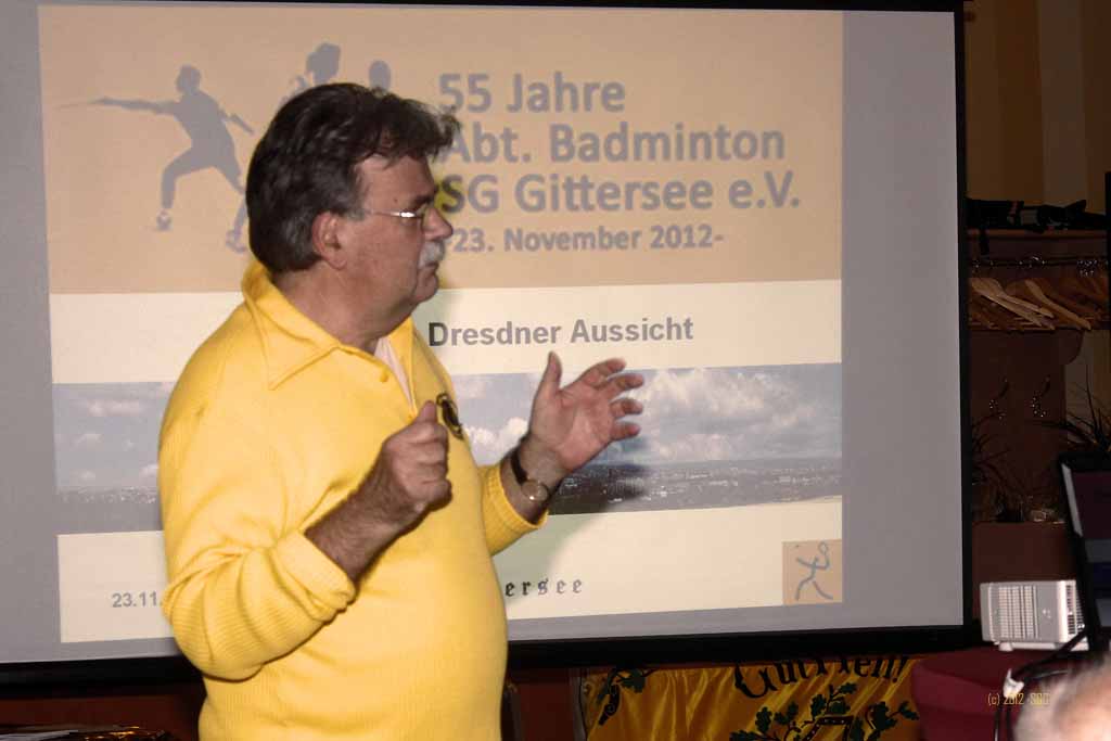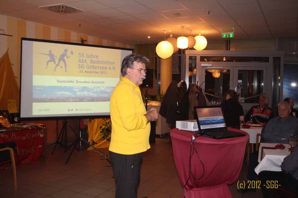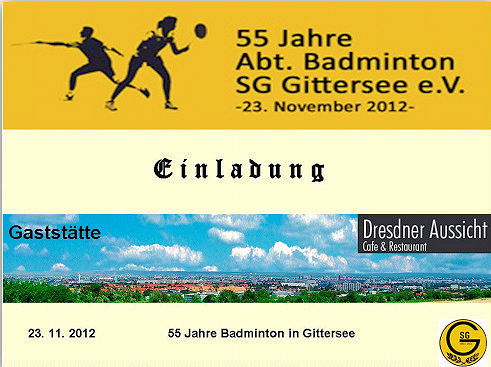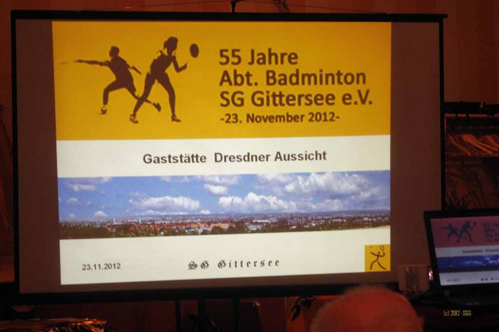 Das 55-jährige Gründungsjubiläum unserer Abteilung Badminton wurde am 23.11.2012 in einer festlichen Veranstaltung im Restaurant Dresdner Aussicht mit 70 Teilnehmern begangen.