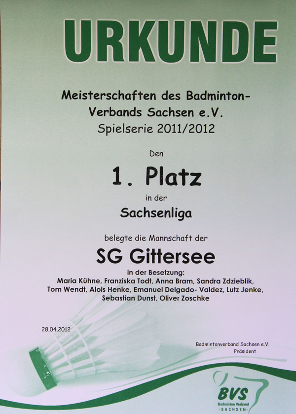 Bei dem am 02.06.2012 in Hoyerswerda ausgetragenen 1. Ranglistenwertungsturnier der Aktiven waren unter den 33 teilnehmenden Herren auch sechs Gitterseer. Mit fünf bzw. vier Siegen bei dem im Doppel-K.-o. ausgetragenen Turnier waren Johannes Scheinpflug und Willi Jugel am erfolgreichsten. Johannes bezwang auf der „Verliererseite“ den an 1 gesetzten Jens Boden (RB Dresden) mit 16:21, 21:15 und 21:19, verlor dann aber anschließend gegen Willi mit 15:21, 21:16 und 15:21. Willi verlor nur gegen den an 2 gesetzten Volker Hempel (BV 57 Niedersedlitz) – beim Spiel um Platz 4 äußerst knapp: 15:21, 21:19, 21:23. Abschlusstand: 5. Willi J., 8. Johannes S.
