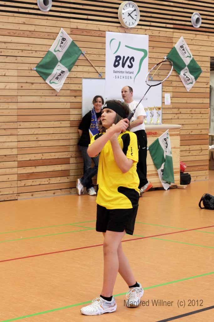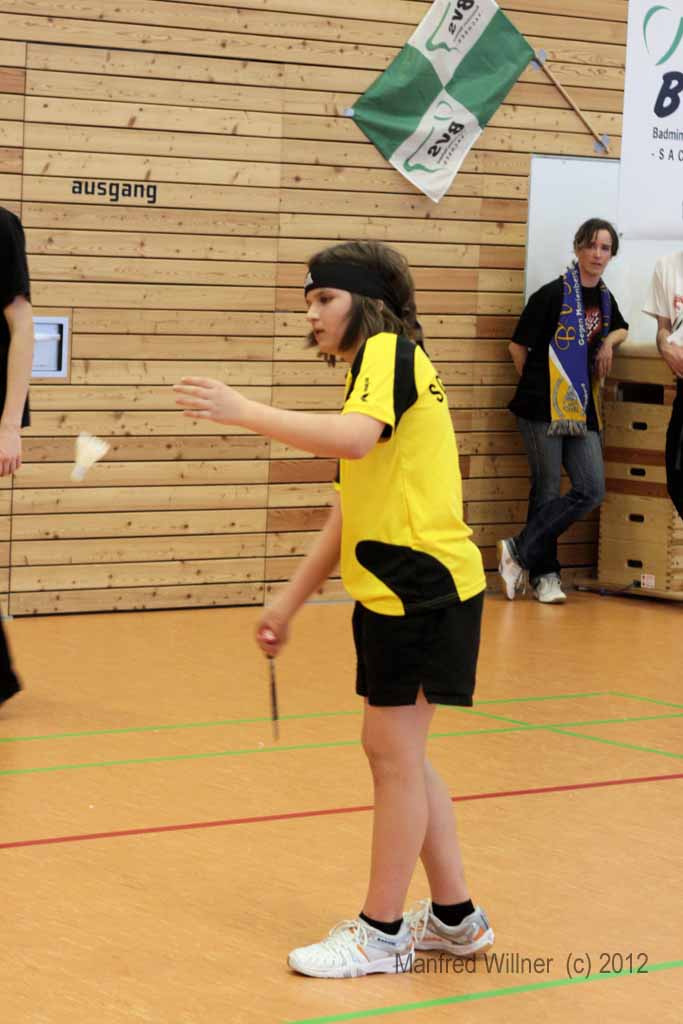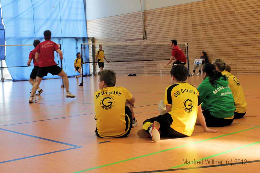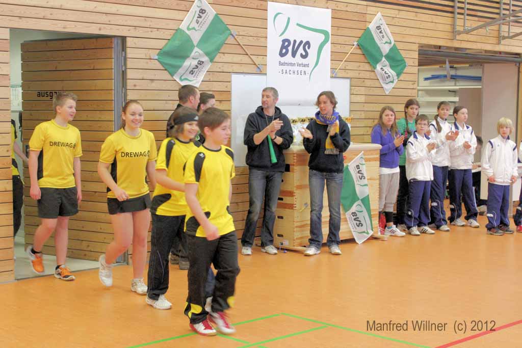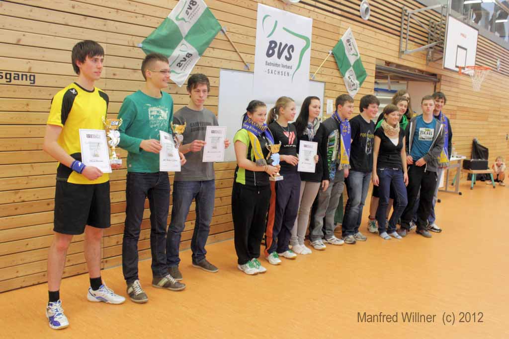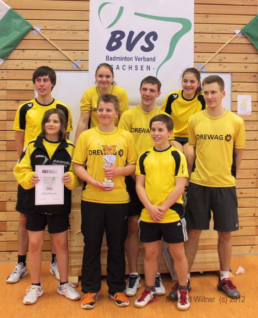 Nach dem 7:1-Auftakterfolg gegen BV Zwenkau 64 und dem 6:2-Sieg gegen die SG Robur Zittau kam es gegen den mit den gleichen Ergebnissen erfolgreichen BV Marienberg zu einem "echten" Endspiel. Die mit vier D-Kadern antretenden und im Schnitt auch ein Jahr älteren Marienberger wurden ihrer Favoritenrolle gerecht und konnten sich gegen unsere gut eingestellten und aufopferungsvoll kämpfenden Spieler behaupten. Wir gewannen das Mädcheneinzel und das Mixed und verloren jeweils erst im Entscheidungssatz das Mädchendoppel mit 20:22 und das 2. Jungendoppel mit 22:24!! –Als Vizemeister haben wir uns damit für die am 31.03. und 01.04.2012 in Königsbronn stattfindenden Südostdeutschen Mannschaftsmeisterschaften qualifiziert.